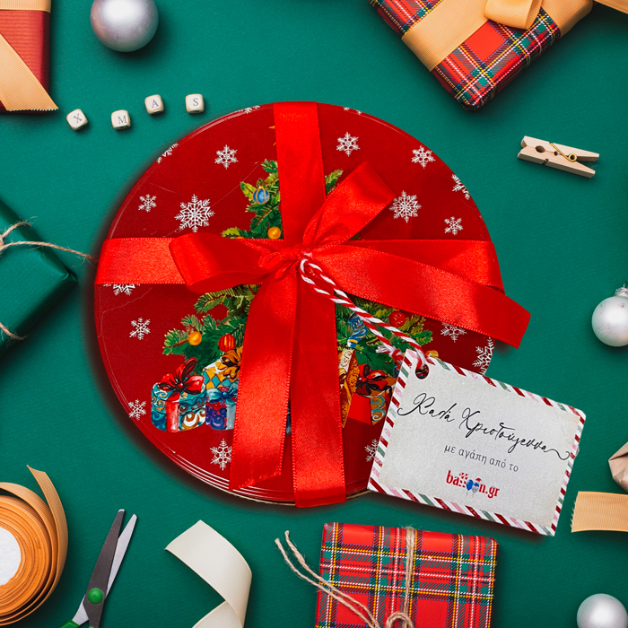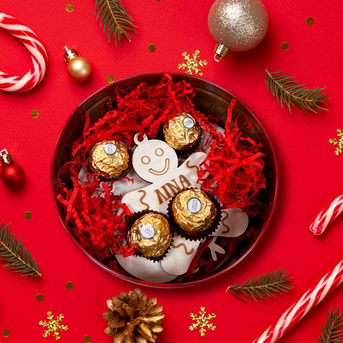 - Περιλαμβάνει: Χριστουγεννιάτικο τσίγκινο κουτί (διάμετρος: 15 cm) και 4 σχηματικά στολίδια με όνομα και σοκολατάκι ferrero rocher