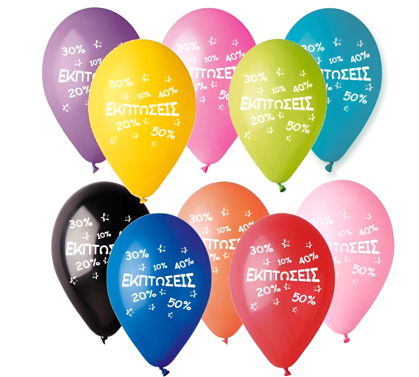 Πολύχρωμα λάτεξ μπαλόνια με εκτύπωση “”ΕΚΠΤΩΣΕΙΣ””, για να στολίσετε το κατάστημα!