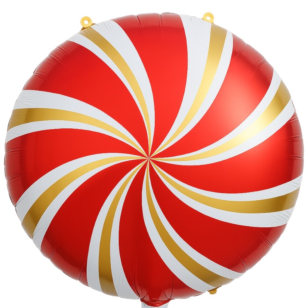 Στρογγυλό foil μπαλόνι με σχέδιο καραμέλα σε χρώματα κόκκινο, λευκό και χρυσό, για να διακοσμήσεις κάθε εκδήλωση!