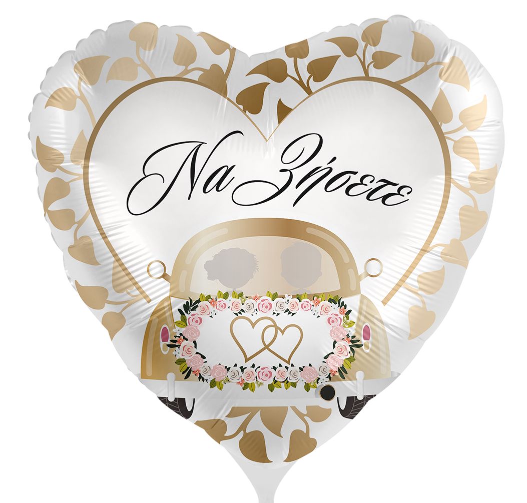 Μπαλόνι καρδιά με ζευγάρι μέσα στο γαμήλιο αυτοκίνητο και μήνυμα “”Να ζήσετε””. Ιδανικό για τον στολισμό του τραπεζιού του γάμου ή του σπιτιού κατά τις γαμήλιες προετοιμασίες!