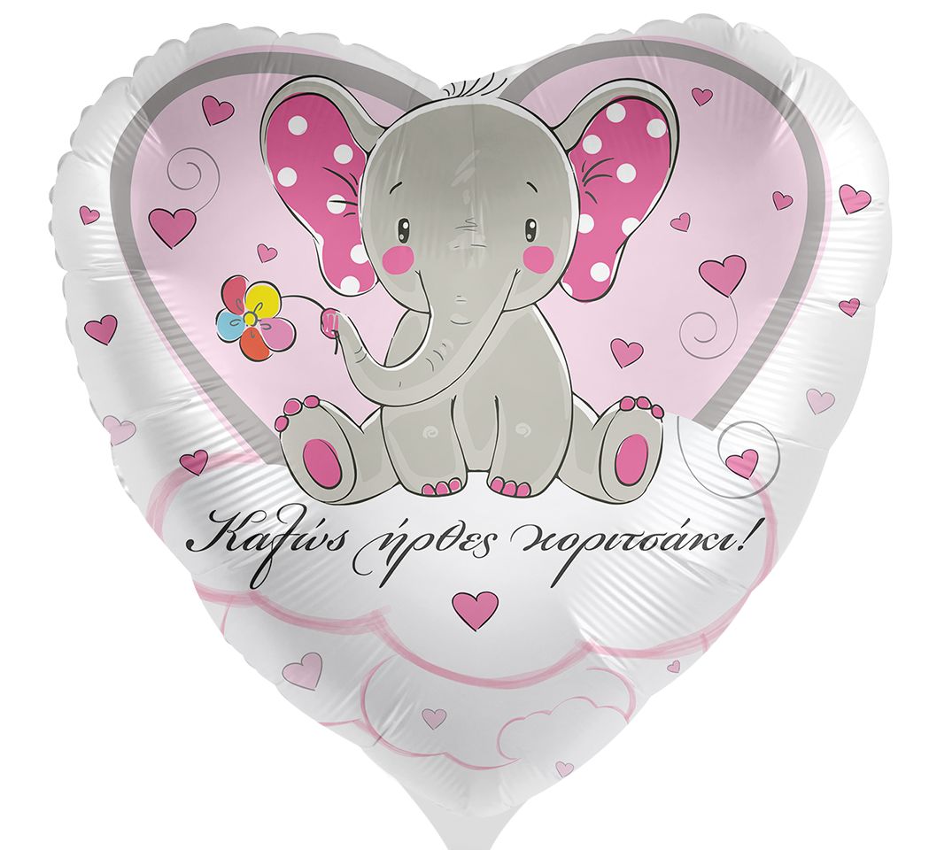 Μπαλόνι σε σχήμα καρδιάς με μήνυμα “”Καλώς ήρθες κοριτσάκι”” σε ροζ με σχέδιο ελεφαντάκι. Ιδανικό για να το χαρίσεις ως δώρο για τον ερχομό του μωρού ή για να στολίσεις το σπίτι για το χαρμόσυνο γεγονός!