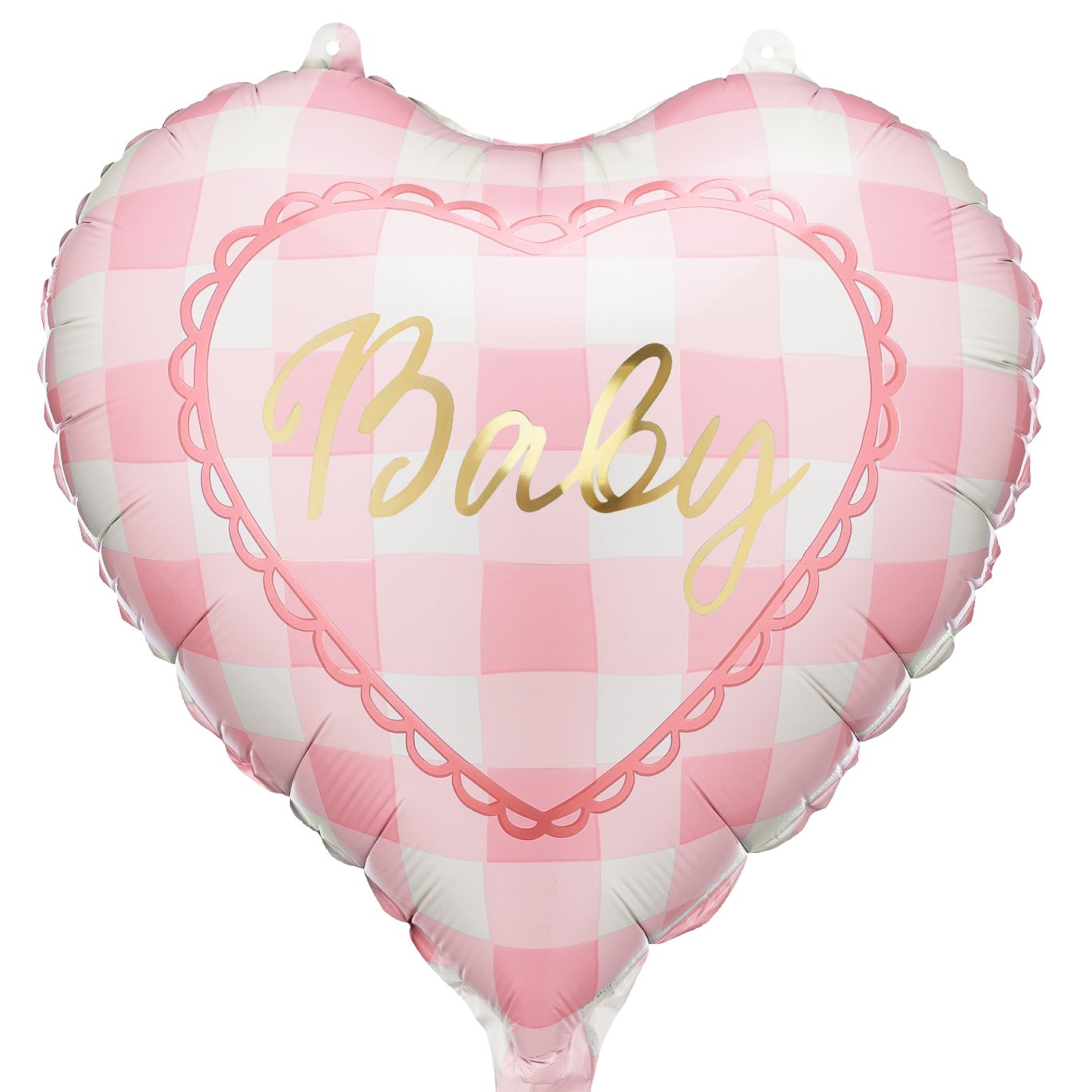 Μπαλόνι καρδιά “Baby” σε ροζ καρό σχέδιο, ιδανικό για baby shower, gender reveal και γιορτή γέννησης. Προσθέτει γλυκιά και χαρούμενη πινελιά στη διακόσμηση του χώρου σας.