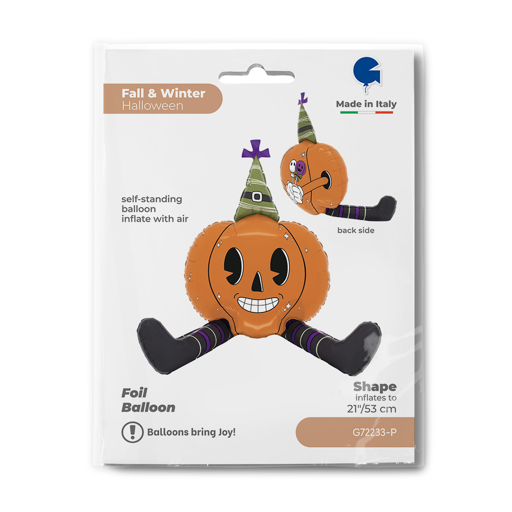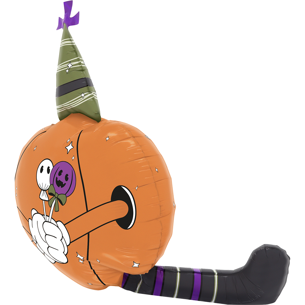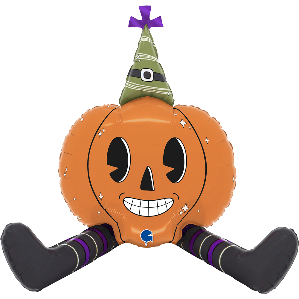 Εντυπωσιακό μπαλόνι κολοκύθα με σχέδιο χαμογελαστό πρόσωπο, πράσινο καπέλο μάγισσας και μαύρα-μοβ πόδια για να δημιουργήσεις την απόλυτη Halloween ατμόσφαιρα!