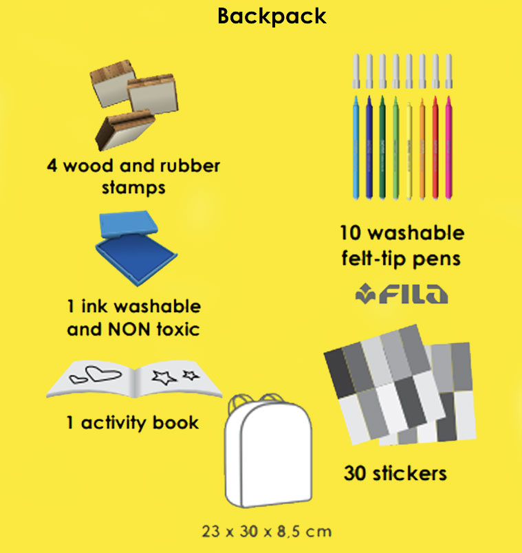 - Η τσάντα περιλαμβάνει: 4 ξύλινες σφραγίδες, 1 ταμπόν με μελάνι, 1 βιβλίο δραστηριοτήτων, 10 μαρκαδόρους, 30 αυτοκόλλητα