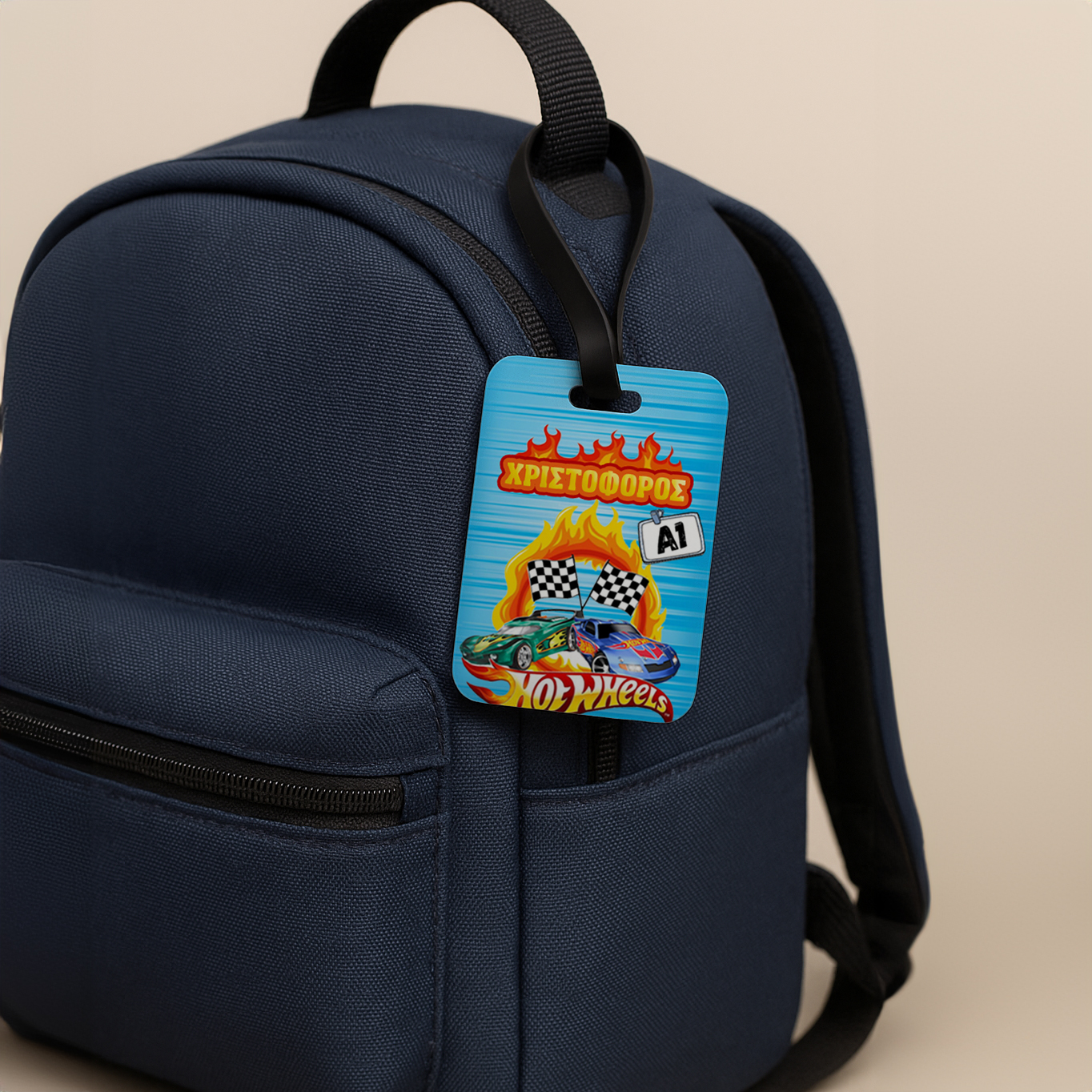 Bag Tag με θέμα Hot Wheels, ιδανικό για σχολικές τσάντες, βαλίτσες ή σακίδια. Το Bag Tag βοηθά στον εύκολο εντοπισμό και δίνει στυλ με αγαπημένα σχέδια.