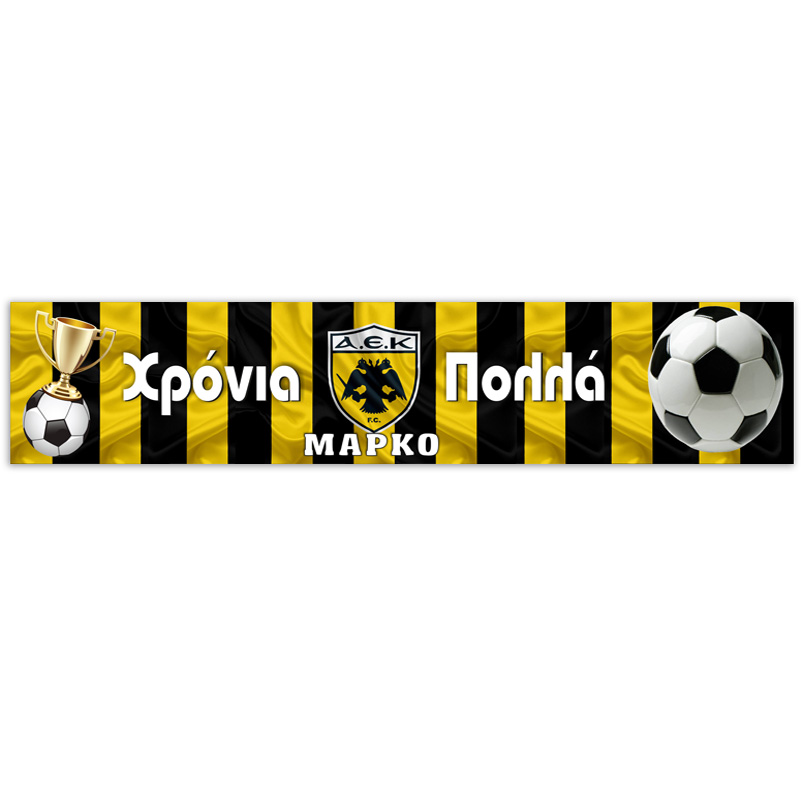 Banner ΑΕΚ και το μήνυμα της επιλογής σας! Μπορεί να χρησιμοποιηθεί ως runner για τη διακόσμηση του τραπεζιού ή ως banner στην πόρτα ή τον τοίχο.