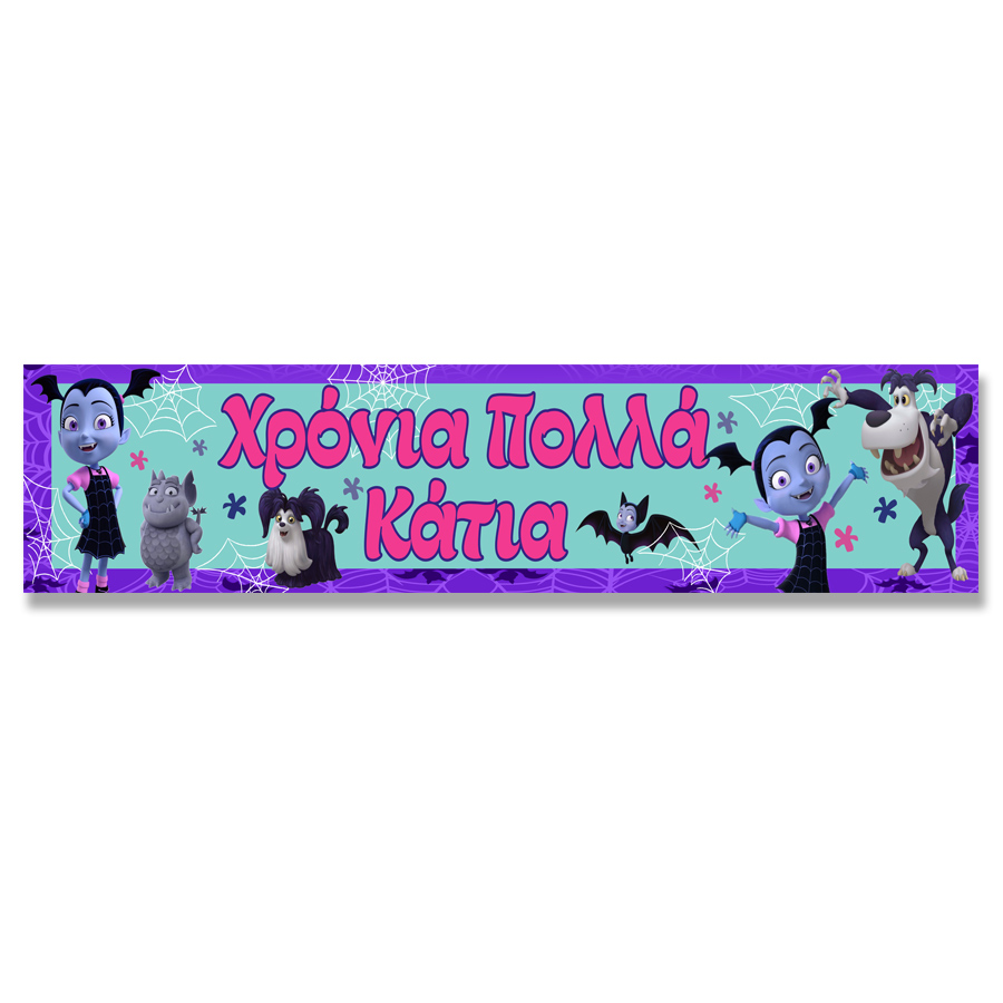 Banner πάρτυ Βαμπιρίνα και τυπωμένο το όνομα της επιλογής σας! Μπορεί να χρησιμοποιηθεί ως runner για τη διακόσμηση του τραπεζιού ή ως banner στην πόρτα ή τον τοίχο.