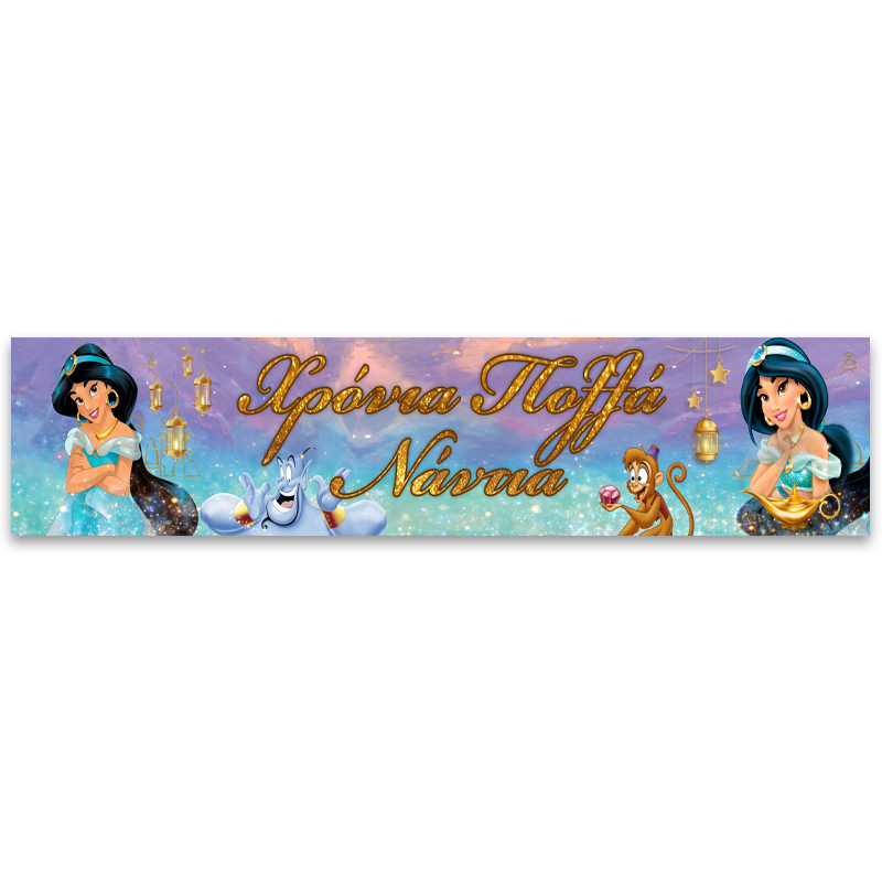 Banner πάρτυ με θέμα Γιασμίν και τυπωμένο το όνομα της επιλογής σας! Μπορεί να χρησιμοποιηθεί ως runner για τη διακόσμηση του τραπεζιού ή ως banner στην πόρτα ή τον τοίχο.