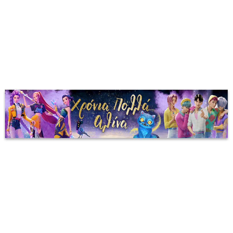 Banner πάρτυ K-Pop Demon Hunters και τυπωμένο το όνομα της επιλογής σας! Μπορεί να χρησιμοποιηθεί ως runner για τη διακόσμηση του τραπεζιού ή ως banner στην πόρτα ή τον τοίχο.