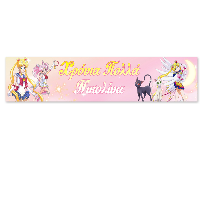 Banner πάρτυ με θέμα Sailor Moon και τυπωμένο το όνομα της επιλογής σας! Μπορεί να χρησιμοποιηθεί ως runner για τη διακόσμηση του τραπεζιού ή ως banner στην πόρτα ή τον τοίχο.