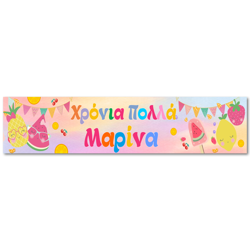 Banner πάρτυ Tutti Frutti και τυπωμένο το όνομα της επιλογής σας! Μπορεί να χρησιμοποιηθεί ως runner για τη διακόσμηση του τραπεζιού ή ως banner στην πόρτα ή τον τοίχο.