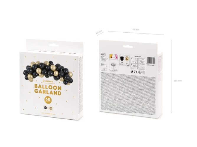 - Το σετ περιλαμβάνει 60 μπαλόνια (48 σε μεταλλικό μαύρο και 12 σε shiny χρυσό) και 2.5m διάτρητη ταινία για γιρλάντες μπαλονιών