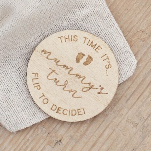 Mummy or Daddy’s Turn? Διασκεδαστικό παιχνίδι flip coin για να κάνεις δώρο σους μελοντικούς γονείς στο baby shower πάρτυ ή στη γέννηση του μωρού! Κάθε φορά που θα πρέπει να αλλάξουν την πάνα του μωρού ή να το ταϊσουν, γυρνάνε το ξύλινο κέρμα και βλέπουν ποιος έχει σειρά να το κάνει!