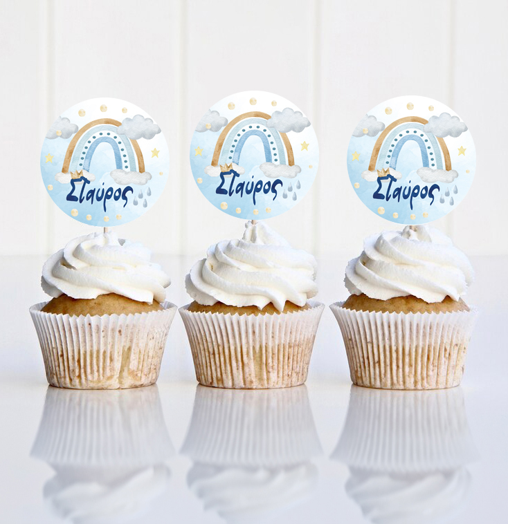 Προσωποποιημένα Topper για να στολίσετε τα ζαχαρωτά και τα cupcake του μπουφέ με θέμα το Ουράνιο Τόξο σε αγορίστικες αποχρώσεις!