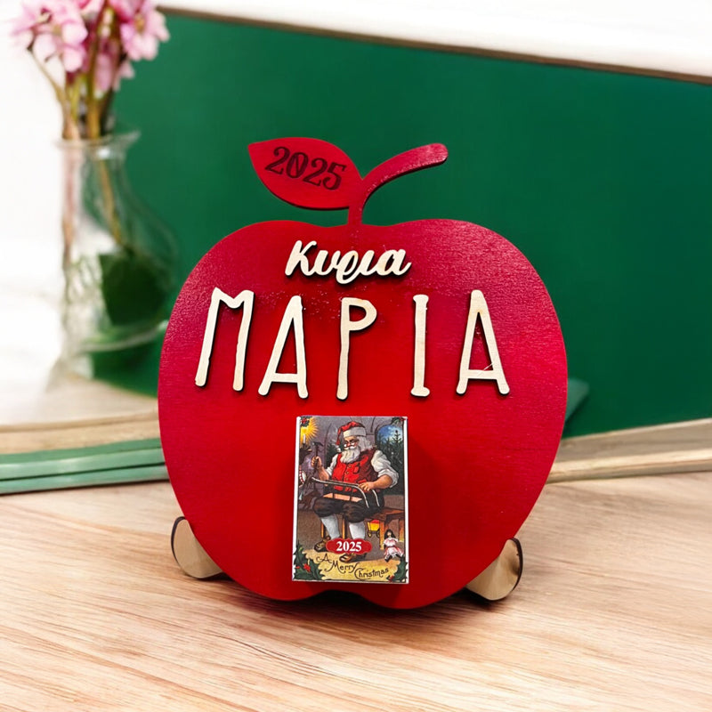 Ξύλινο επιτραπέζιο Ημερολόγιο 2025 με βάση σε σχήμα Μήλο. Χαρίστε ένα πρωτότυπο και όμορφο δωράκι στον δάσκαλο ή την δασκάλα σας που θα διακοσμεί τον χώρο τους όλο τον χρόνο!