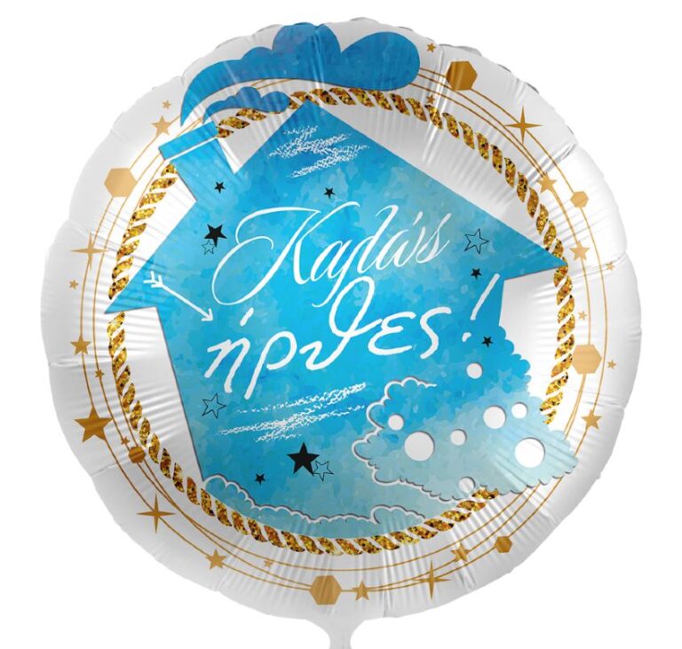 Μπαλόνι με μήνυμα ""Καλώς ήρθες"" και φόντο γαλάζιο σπίτι. Ιδανικό για να το χαρίσεις ως δώρο για τον ερχομό του μωρού ή για να στολίσεις το σπίτι για την υποδοχή ενός αγαπημένου προσώπου!